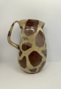 Une carafe née de la main experte, où le grès beige prend vie sous le tracé libre de taches brunes irrégulières. Sa silhouette élancée évoque le cou gracile d’une girafe, tendu vers le ciel sur une plaine immobile. Chaque courbe, chaque épaisseur volontairement modulée, raconte l’histoire d’un geste libre, entre maîtrise technique et inspiration animalière.