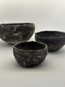 Ces bols sont modelés individuellement, avec une recherche de texture et de forme libre. Ils évoquent la terre brute, la pierre volcanique, ou encore des fragments de nature fossilisée. Chaque pièce est une œuvre en soi.