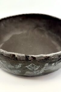Un saladier sombre et dense, à l’allure brute et minérale, comme extrait d’un bloc de pierre volcanique. La forme généreuse, façonnée librement à la main, joue des contrastes entre surfaces lisses et aspérités granuleuses. Les bords irréguliers et le relief prononcé soulignent le caractère organique, presque sauvage, de chaque pièce.