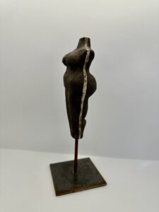 Figure sombre et élancée, dense dans son expression minérale. Chaque courbe se dessine entre force et douceur, tandis que la matière brute révèle ses grains intrigants.