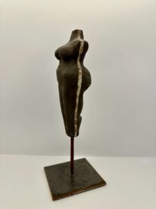 Figure sombre et élancée, dense dans son expression minérale. Chaque courbe se dessine entre force et douceur, tandis que la matière brute révèle ses grains intrigants.