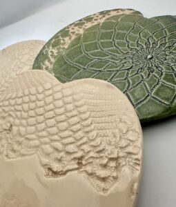 Ces dessous de plat en céramique sont réalisés à la main, en forme de cœur, avec une surface texturée à partir de véritables napperons anciens — ceux de l’arrière-grand-mère et grand-mère de la créatrice. Chaque empreinte est unique, révélant des motifs de dentelle, de crochet ou de textile fin.
