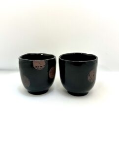 Ces tasses à espresso sont façonnées à la main en grès rouge de Bourgogne puis recouvertes d’un émail noir brillant. Chaque pièce est ponctuée de motifs légers, semblables à des fleurs blanches qu’on souffle et qui s’envolent — comme des pétales ou des graines de pissenlit. Le contraste entre le fond sombre et les empreintes cuivrées crée une esthétique poétique et discrète.